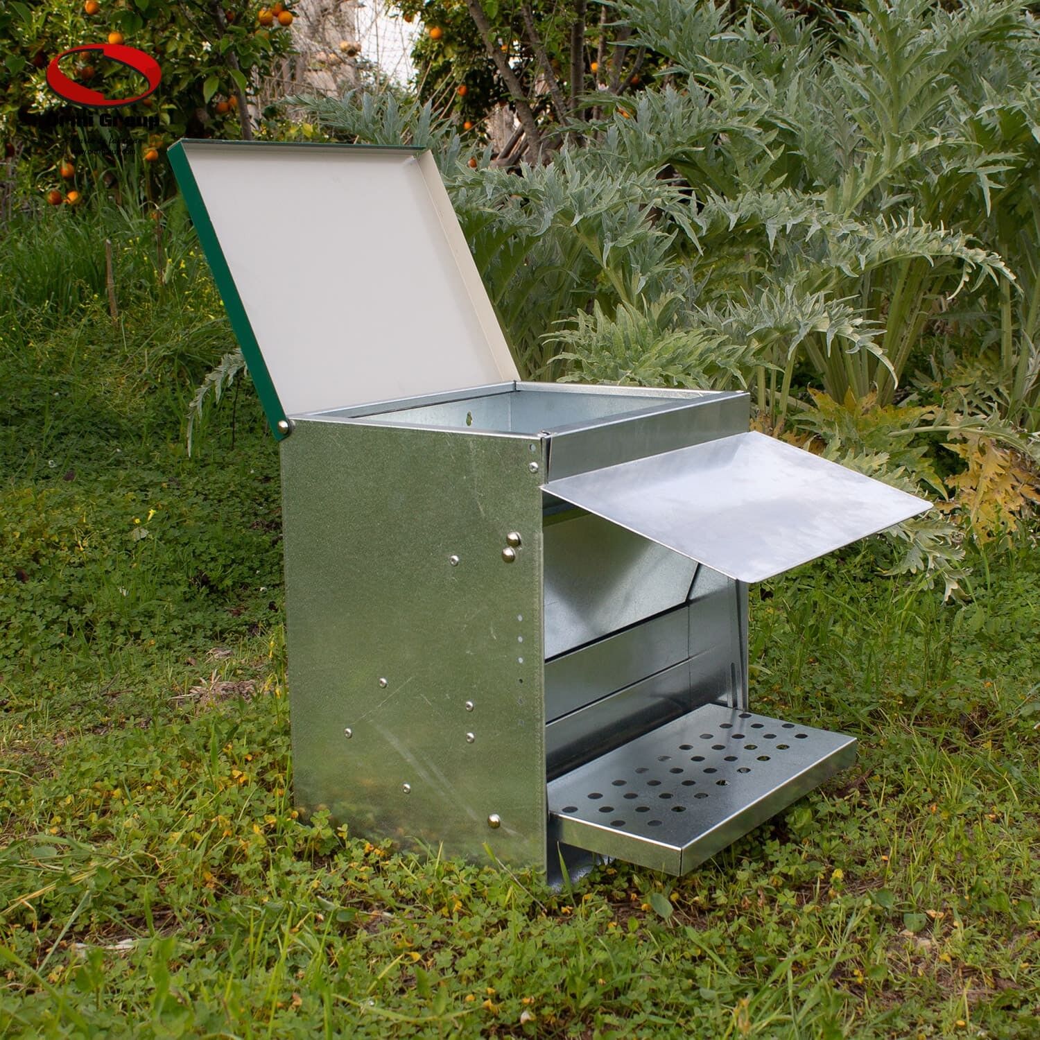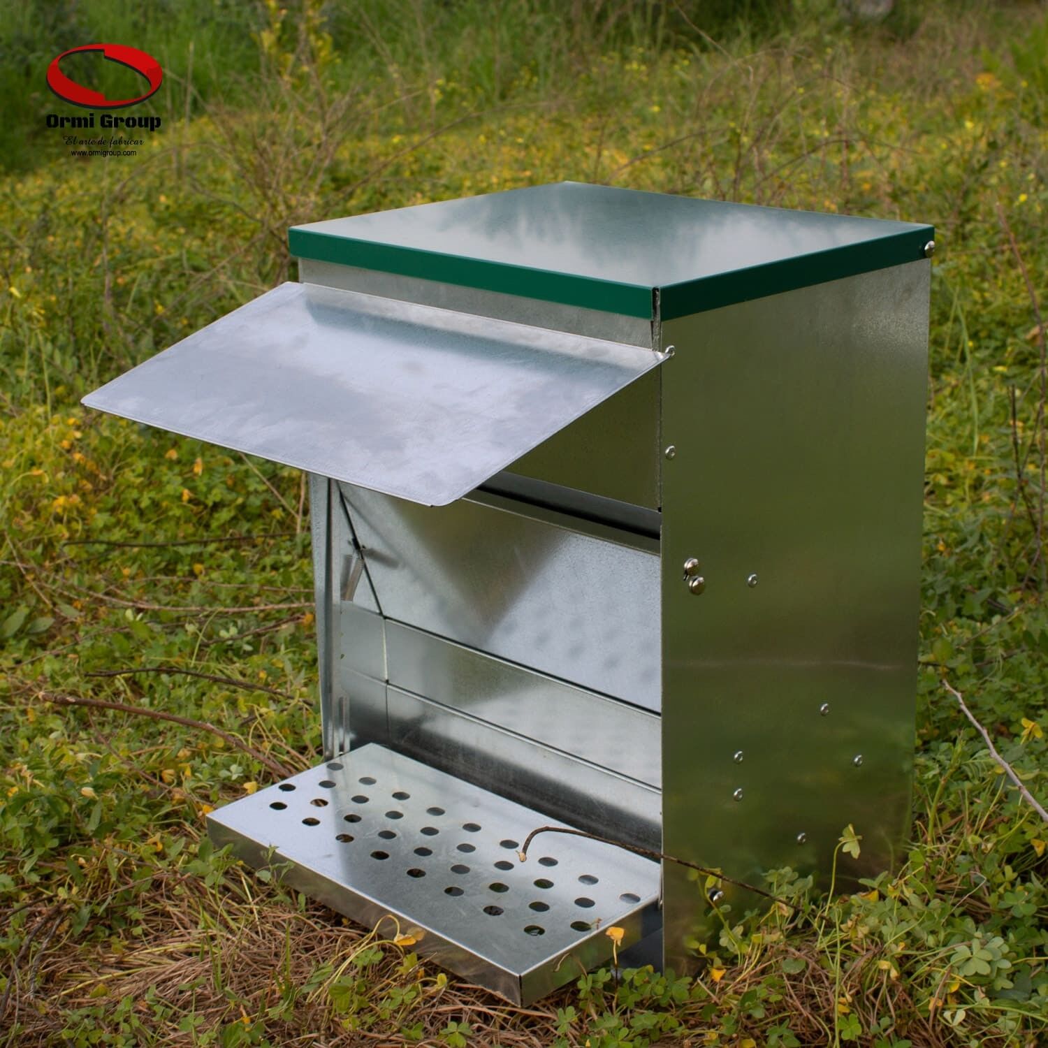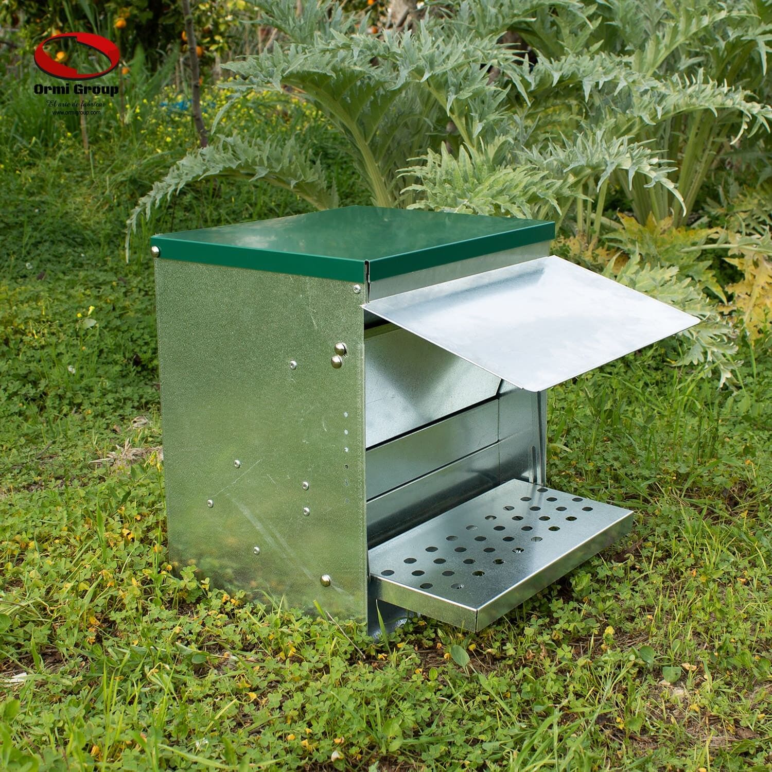 The top cover can be opened from the front or from the back to fill with feed.